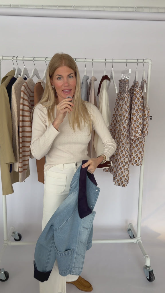 • A versatile denim layer designed to pair seamlessly with dresses, knits, and denim